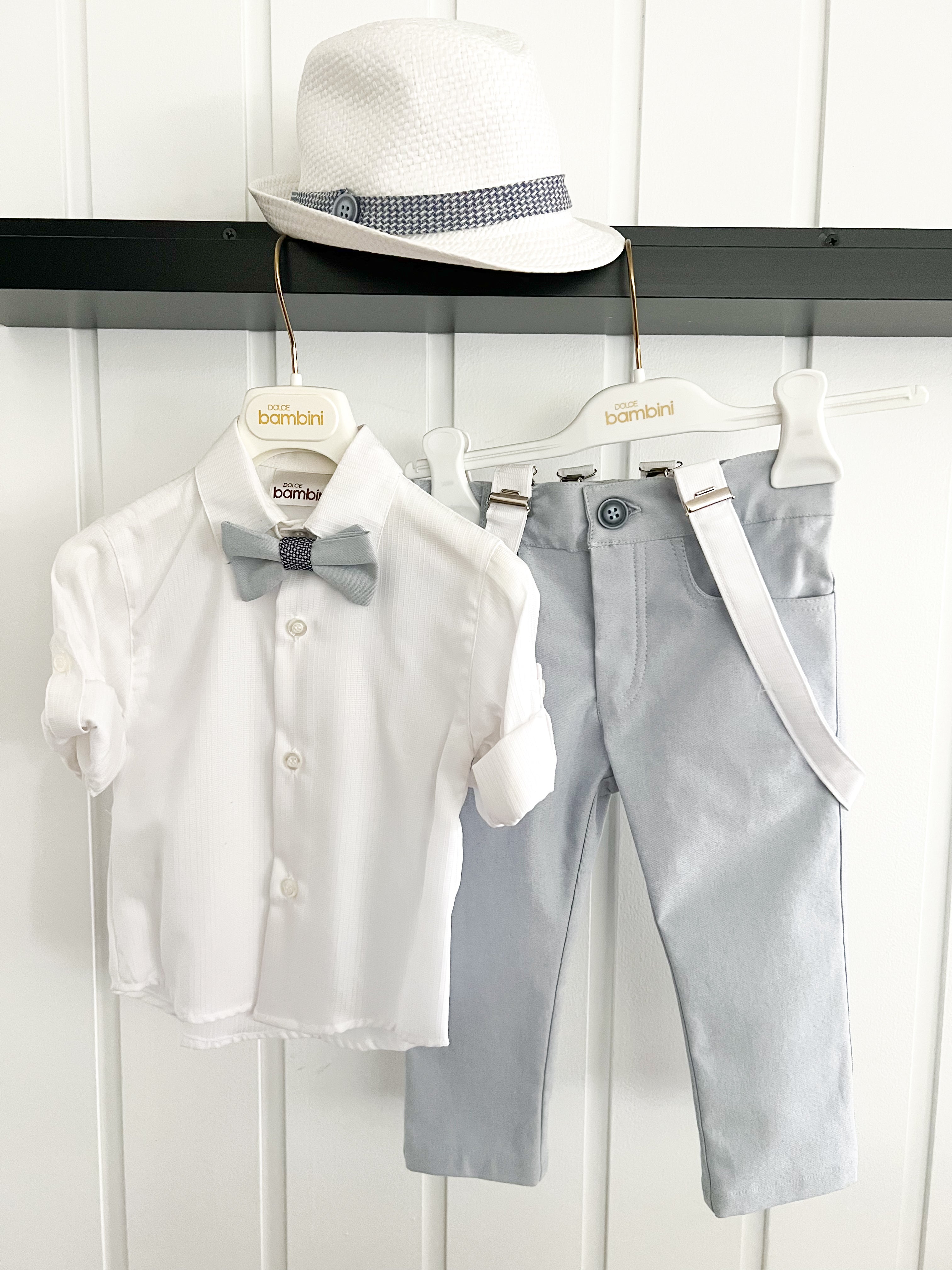 includes- jacket, long sleeve shirt with sleeves that can be rolled and tagged up, bow tie, fedora hat, trousers with suspenders. Tailored in bamboo cotton.