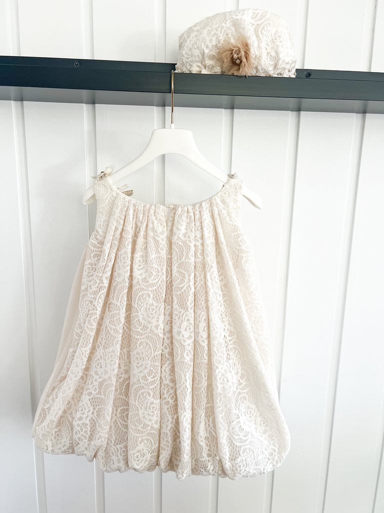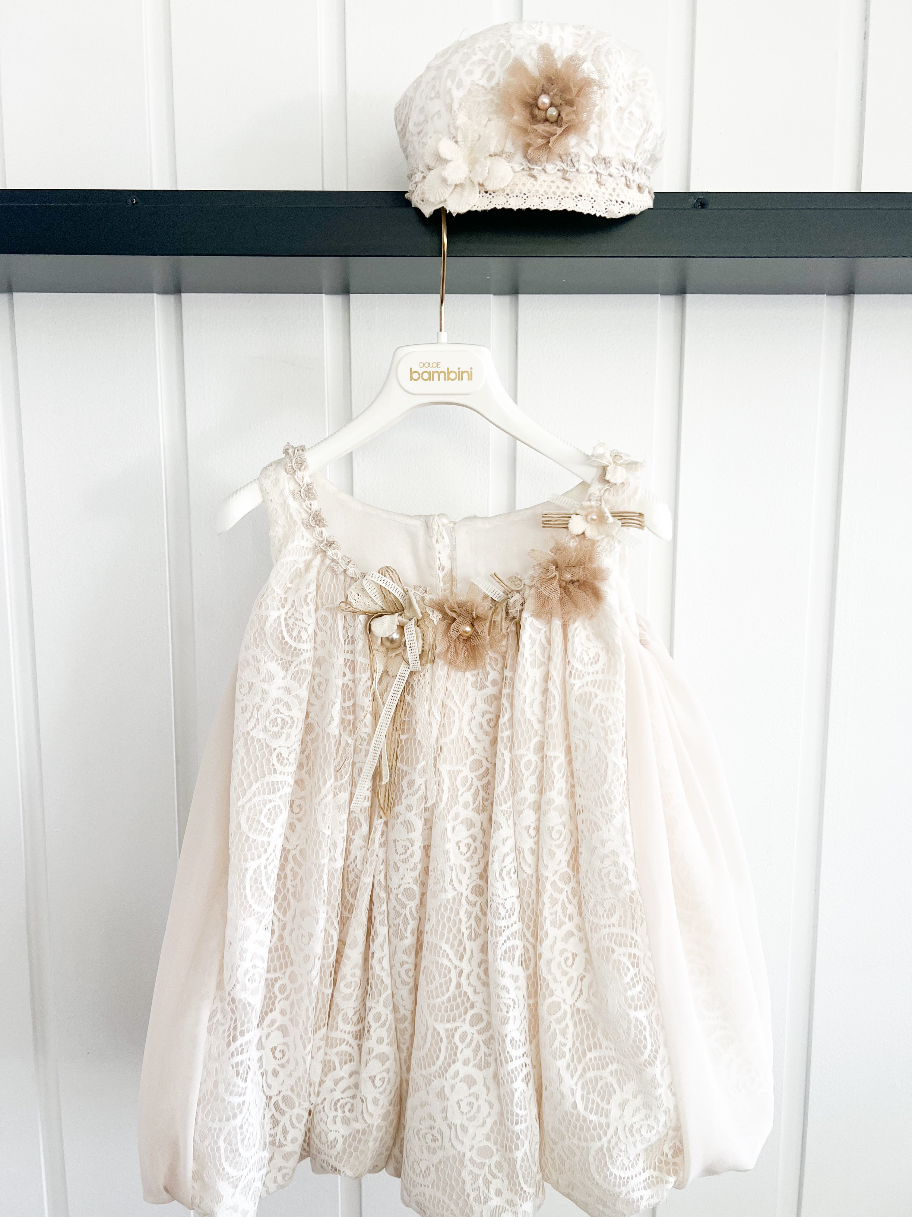 Experience the beauty and elegance of the special occasion dress named OLYMPIA. Handcrafted in Greece with delicate lace and chiffon it features a balloon hem -this dress flows softly and is adorned with vintage style lace and flower details around the neckline. The matching cap completes the perfect ensemble for any special event. Embrace the timeless style and quality of OLYMPIA, designed by Dolce Bambini.