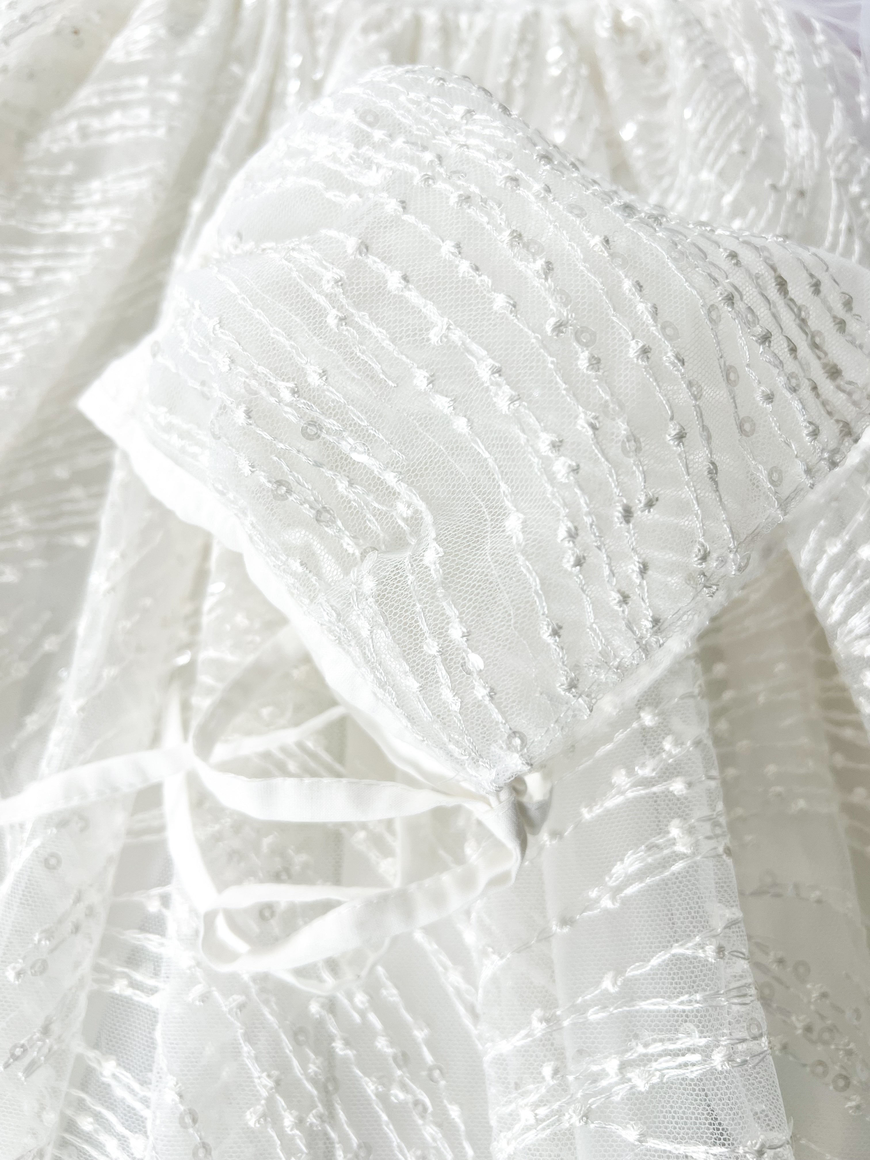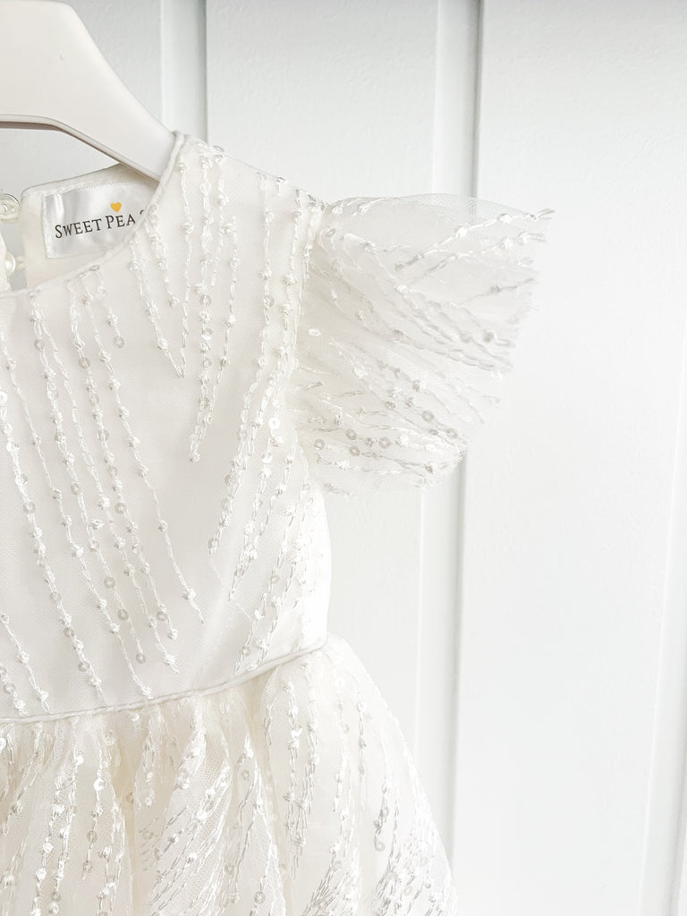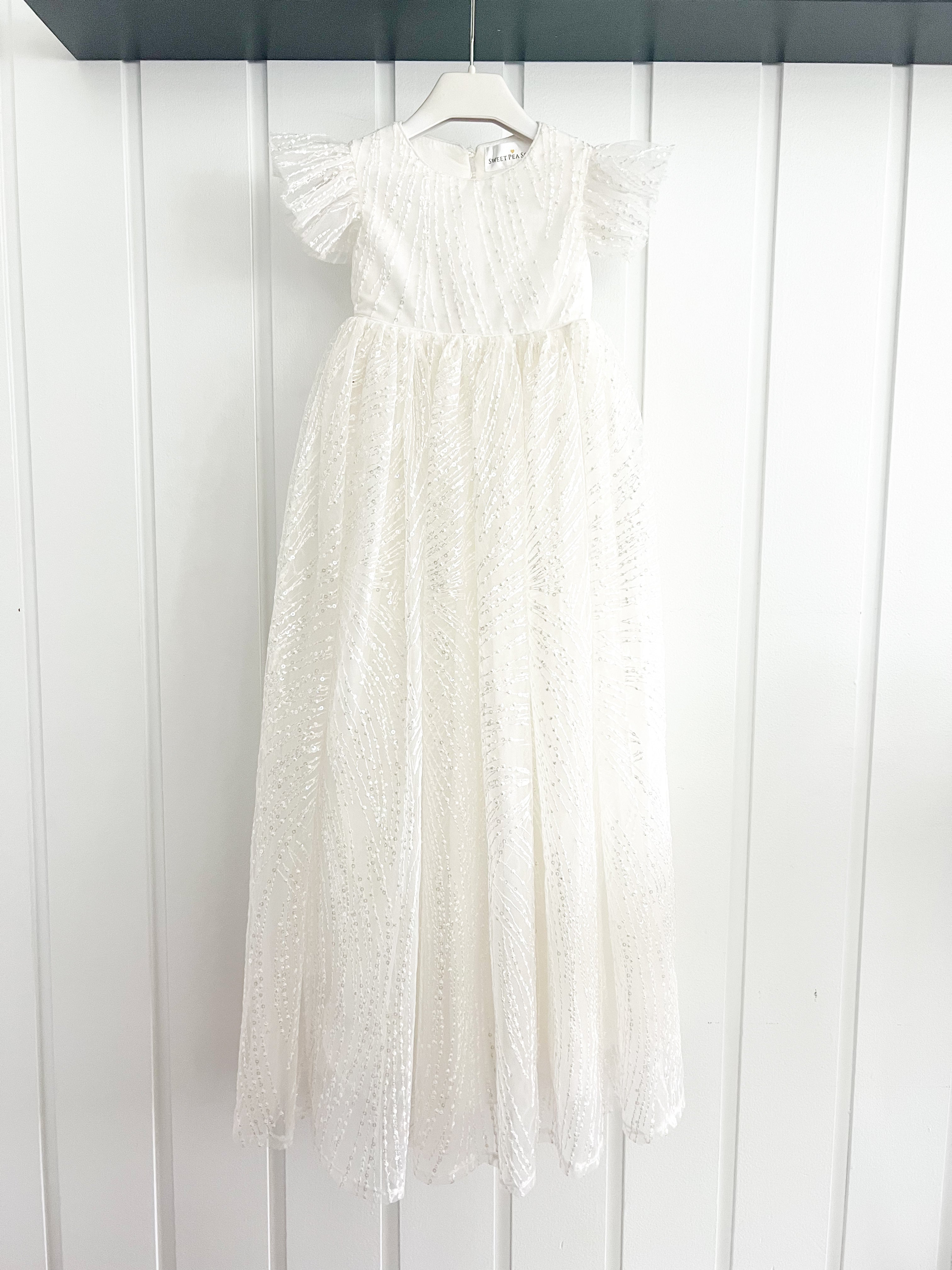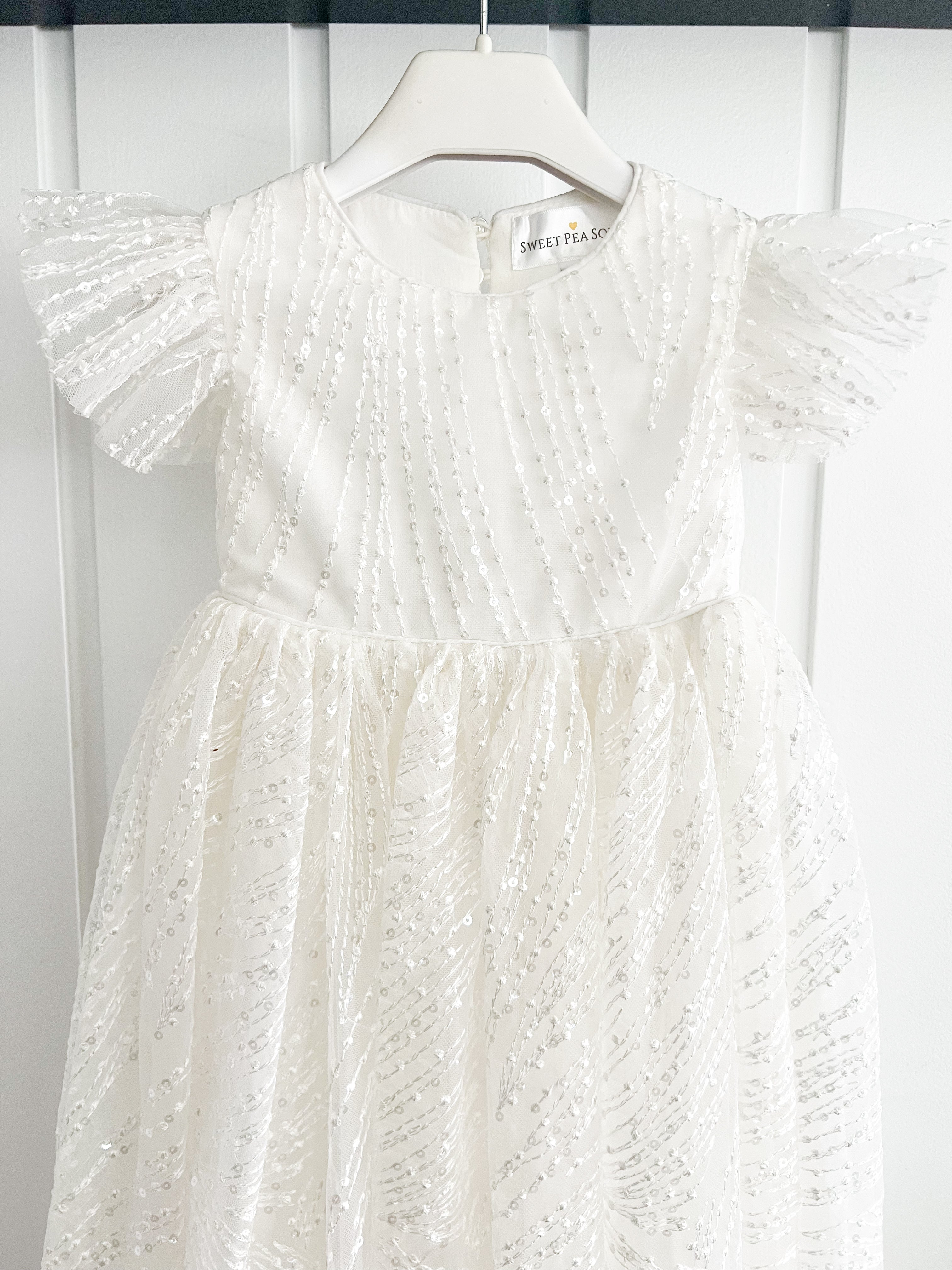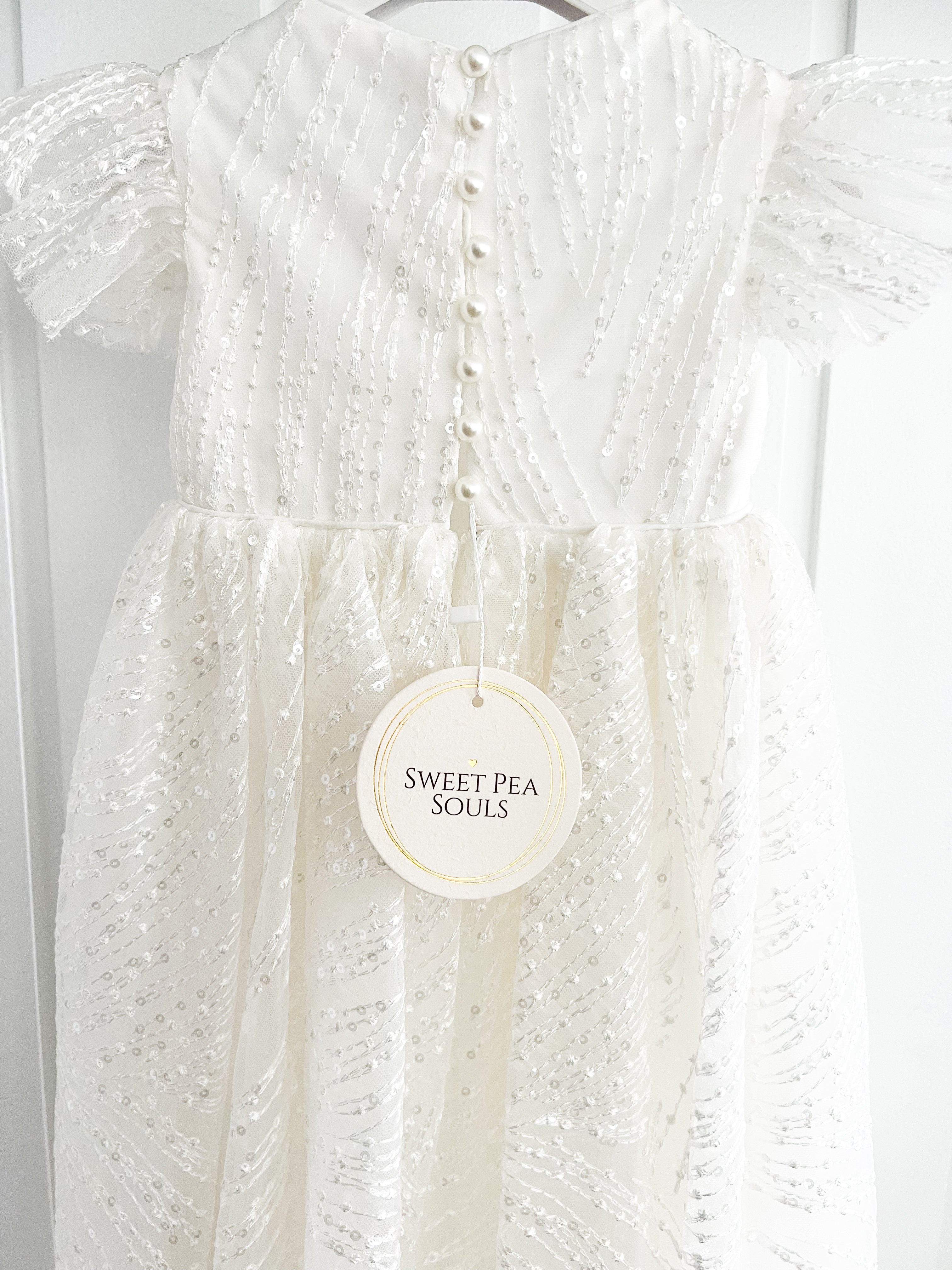 A beautiful sample dress from Sweet Pea Souls. Flutter sleeves, matching bonnet.