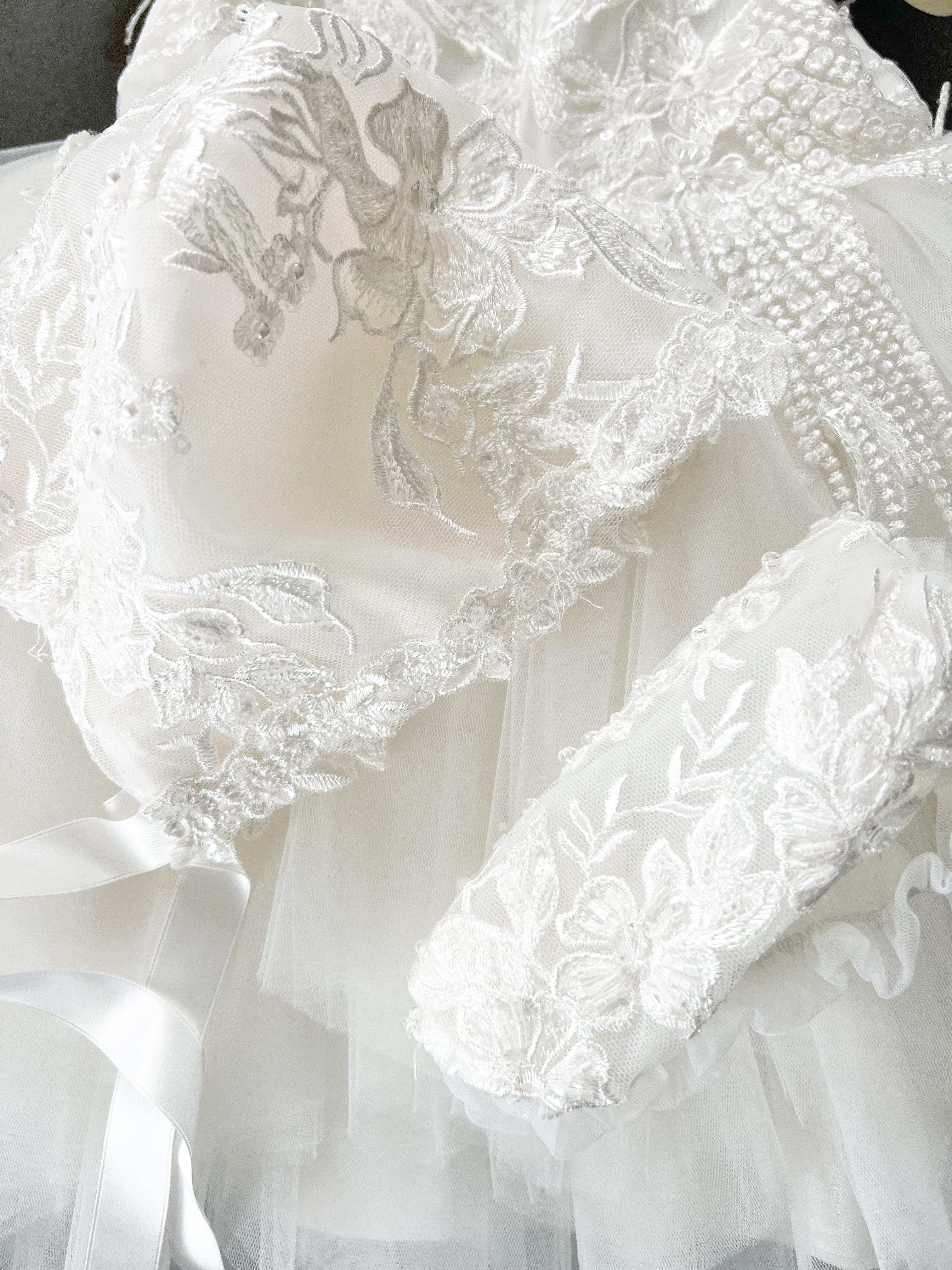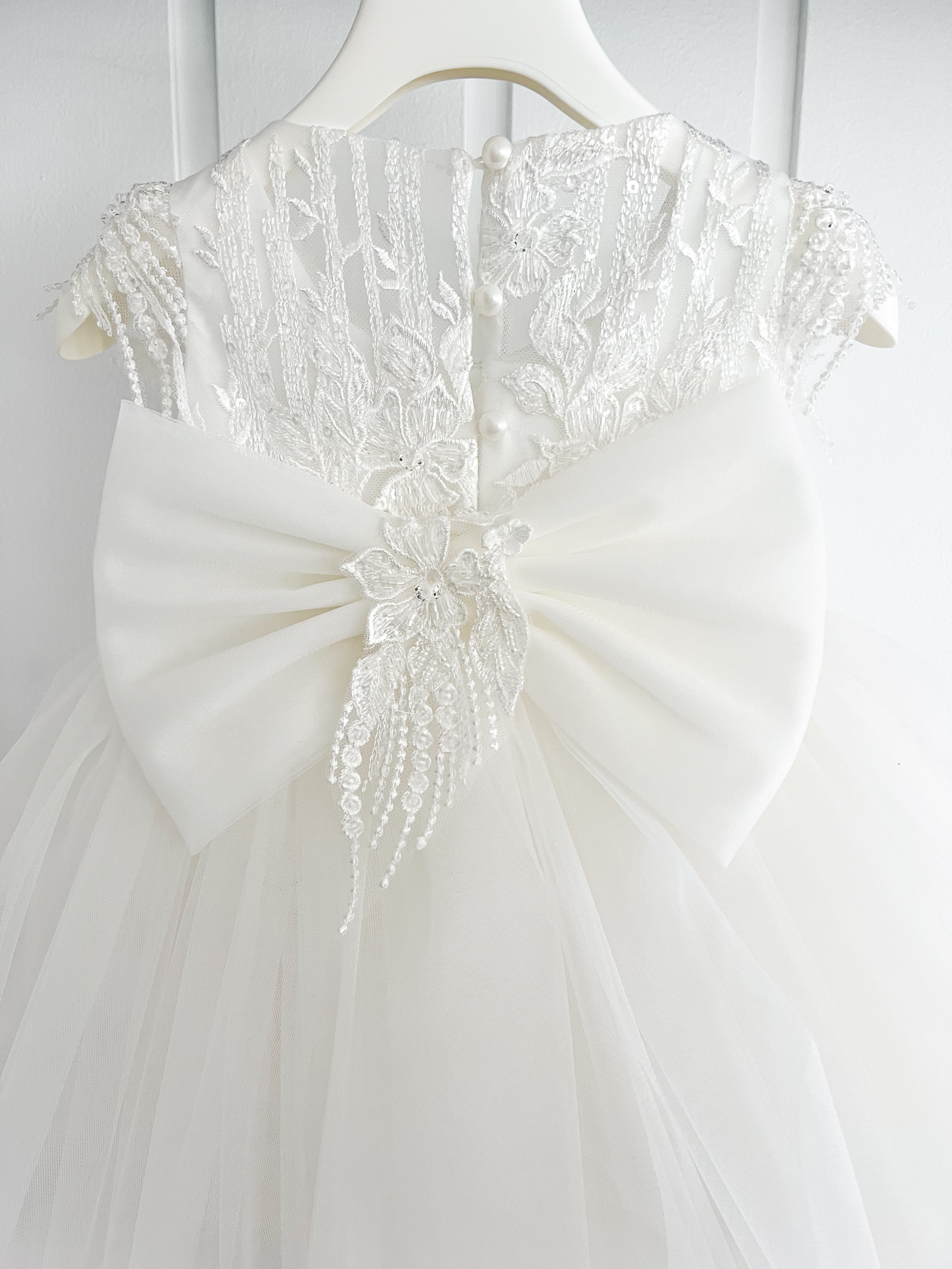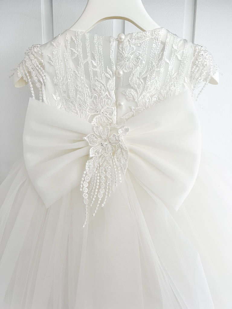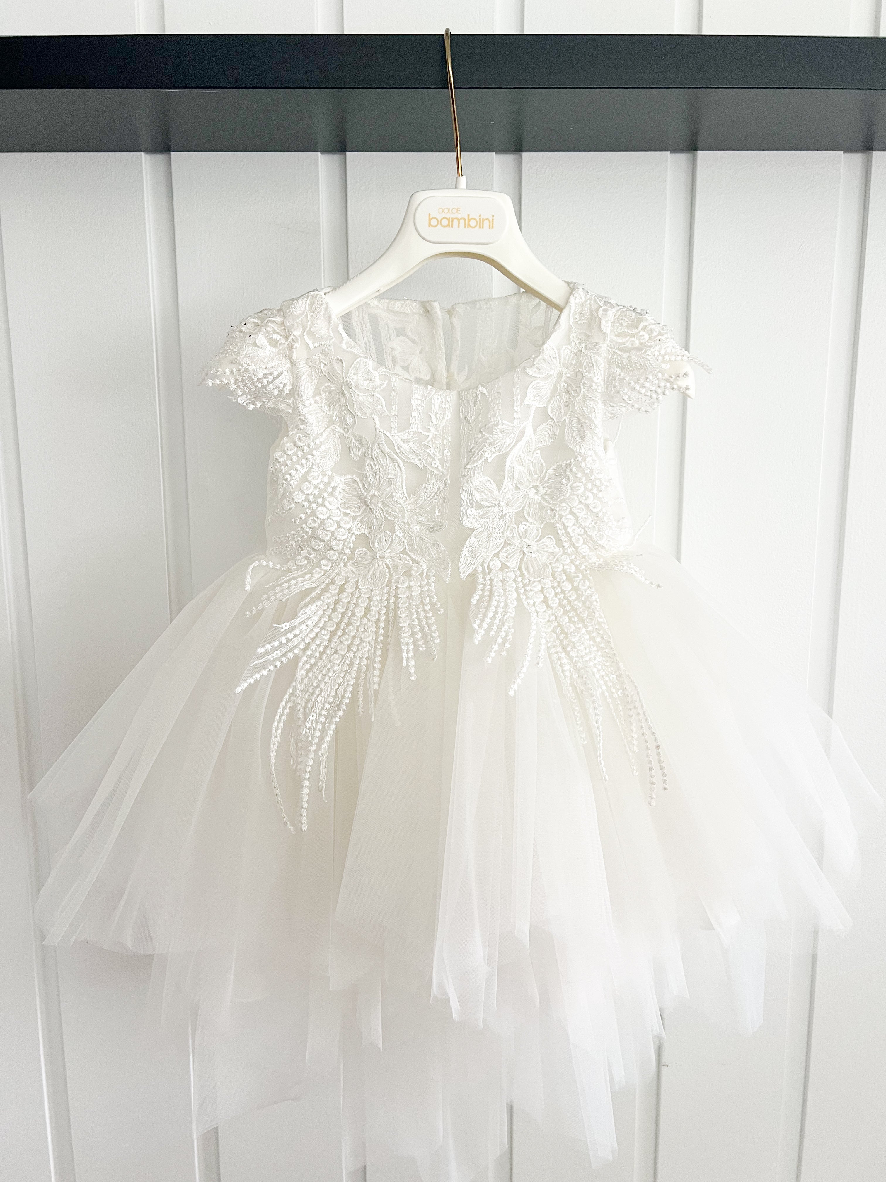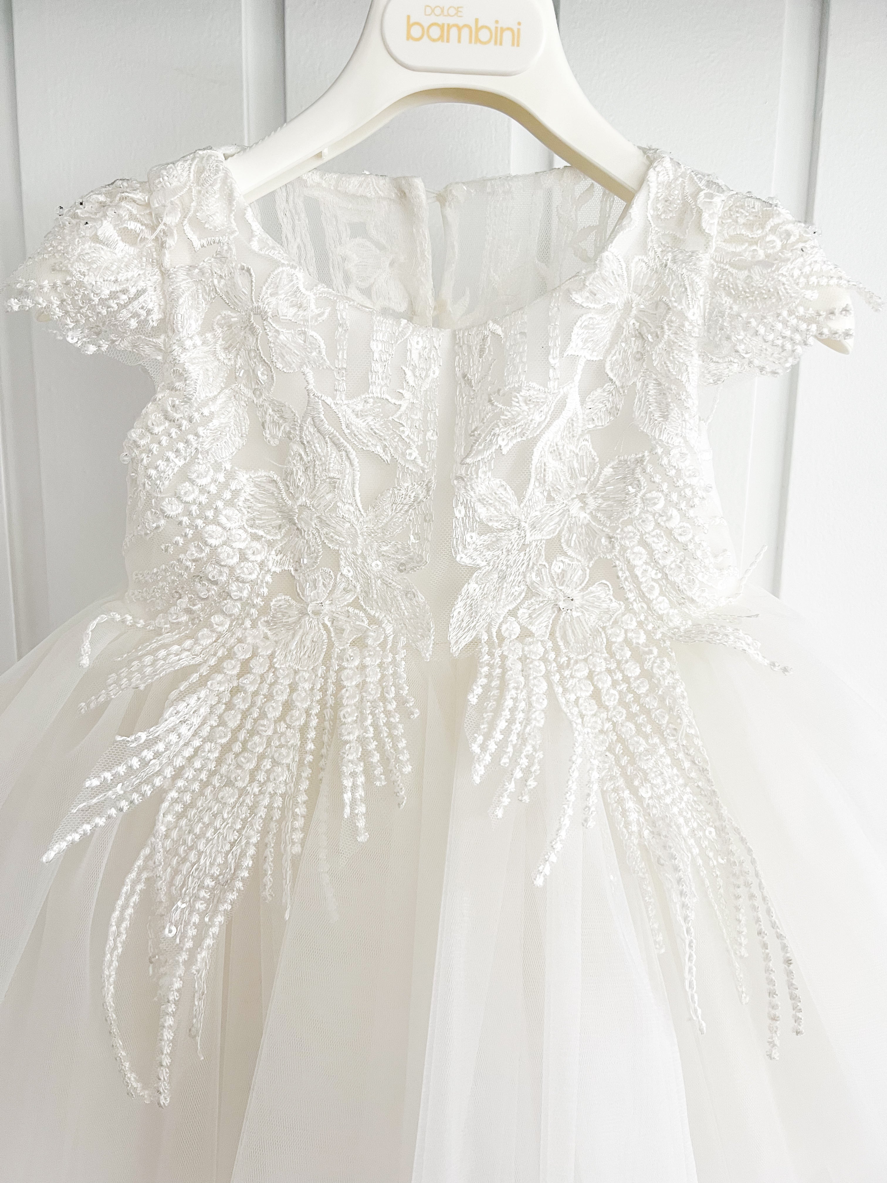 Beautiful dress design from Dolce Bambini featuring full tulle layered skirt and beaded bodice, turn her around and there is a beautiful big bow. Also includes bonnet and headband.