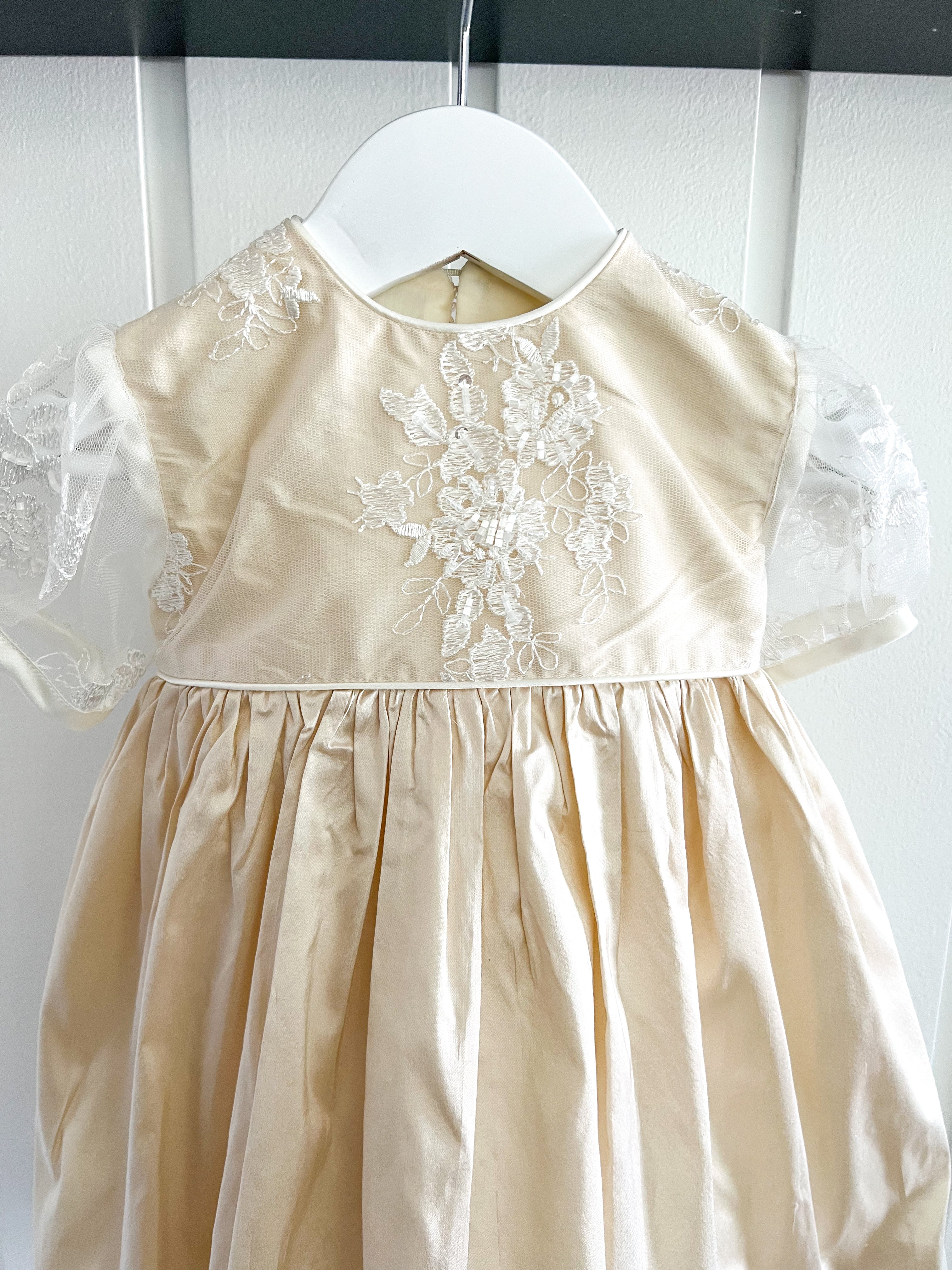 Designed and made in Australia this latte silk and lace Christening Dress is so sweet. Includes matching booties and silk bonnet