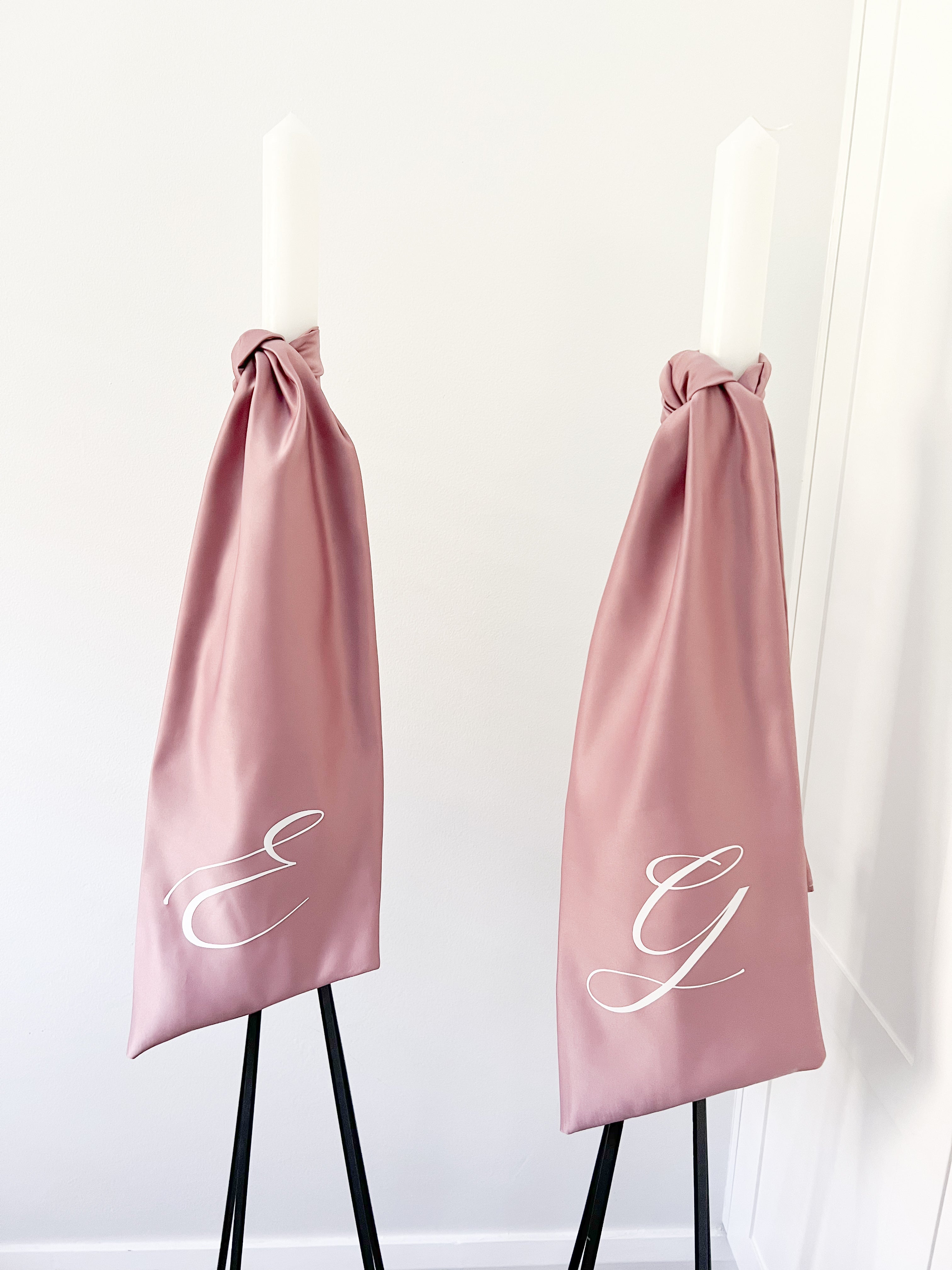 Enhance the elegance and beauty of your special day with our DUCHESS SATIN INITIAL CANDLE. Our white round candles are adorned with carefully sewn sashes and delicately tied with couples' initials, resulting in a stunning and personalized touch. You can choose from a variety of colors for the Duchess Satin and embossing, making it a perfect fit for any theme or color scheme. Let us help you create a memorable and magical atmosphere with our impeccable candle design.