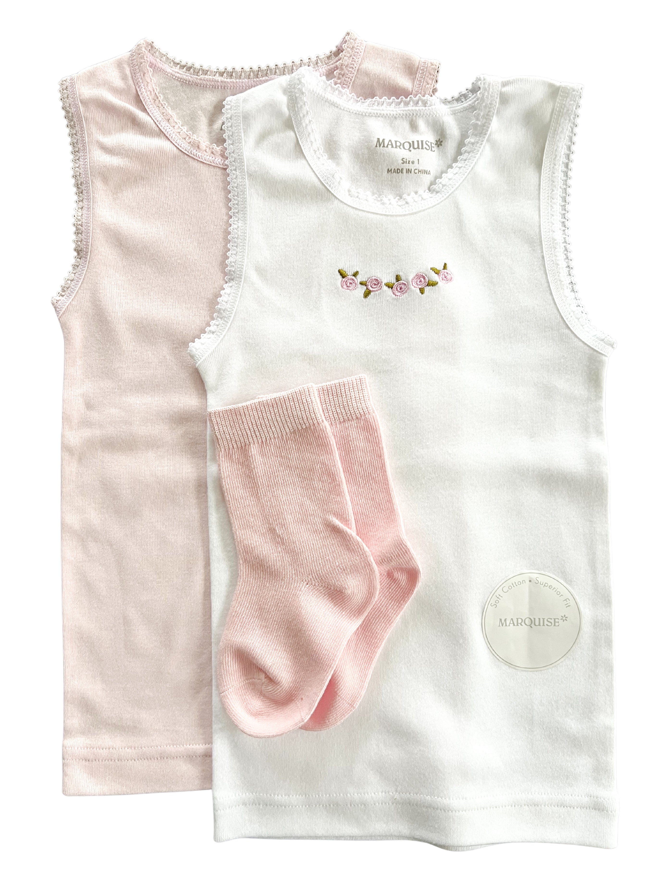 100% white and pink cotton with lace trim around neckline and armholes. Sweetest little embroidered flowers on the white singlet. Pink cotton socks.