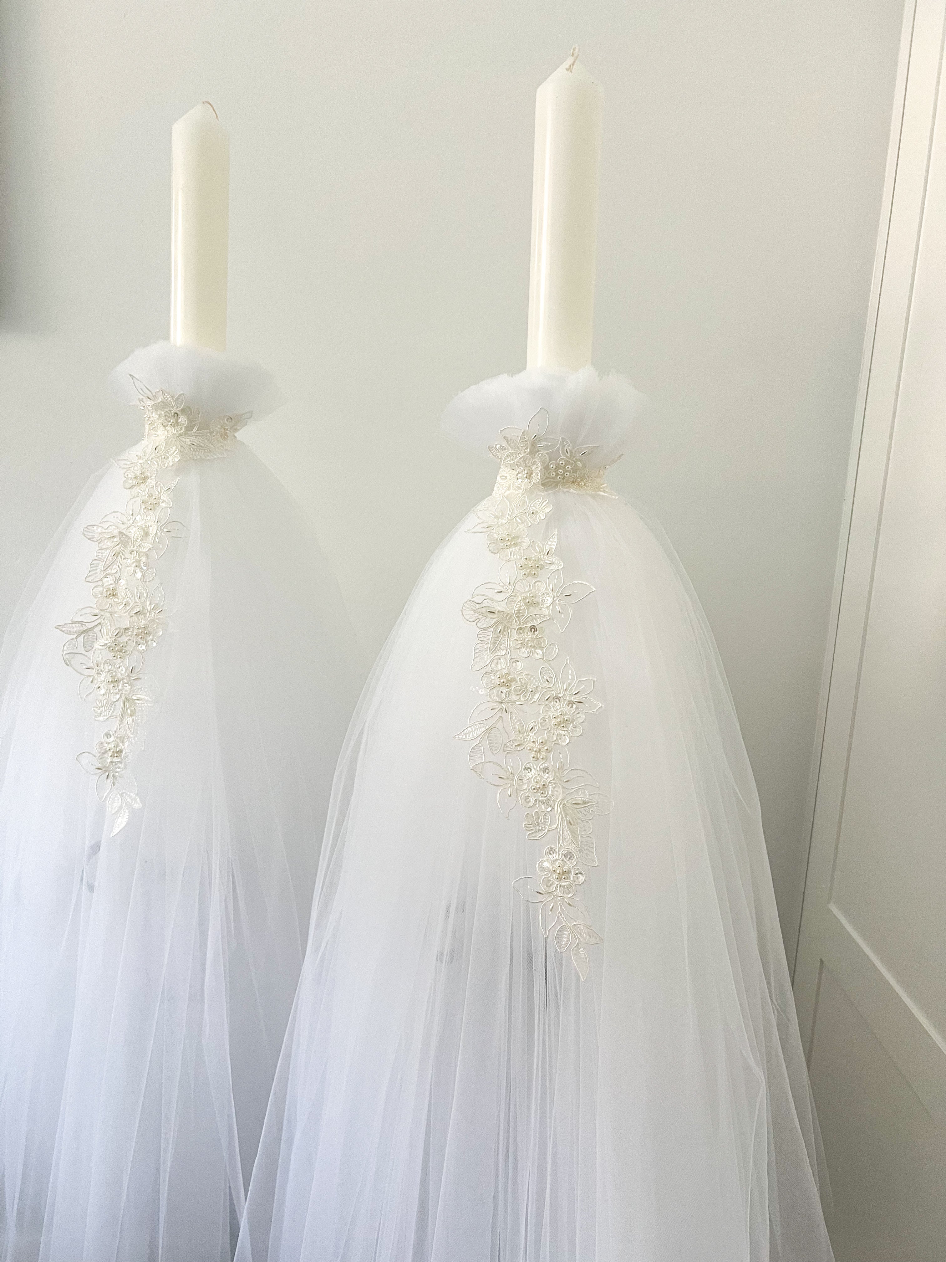 Experience the ultimate elegance with our soft and luxurious TULLE WITH LACE MOTIF. The intricate lace motifs delicately adorn the top and front of the soft white bridal tulle, creating a romantic and delicate look. This stunning design is showcased on our round white 2 inch candles, perfect for adding a touch of charm to any occasion.